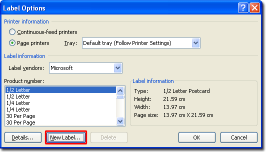 Click "Label Options" and the following dialog box will appear. You will need to add the label shape you have to the list, so click "New Label". (For this example we will be using 431)