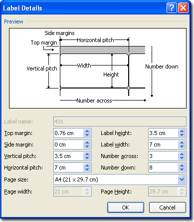 Fill in the label properties. These can be found on each product's page on this website. Be careful to pay attention to the difference between millimetres and centimetres.